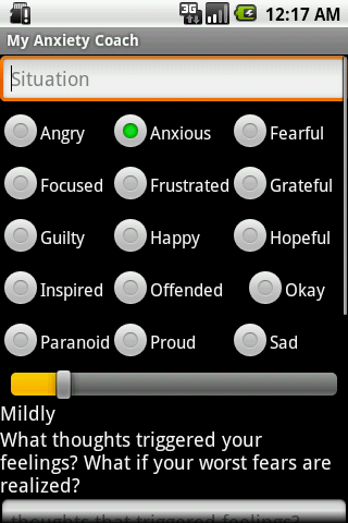 My Anxiety Coach is a private and personal application to help the user identify events and situations in life that cause anxiety. Recording everyday anxieties over a period of time can help in identifying the triggers that cause anxiousness, stress, and depression.