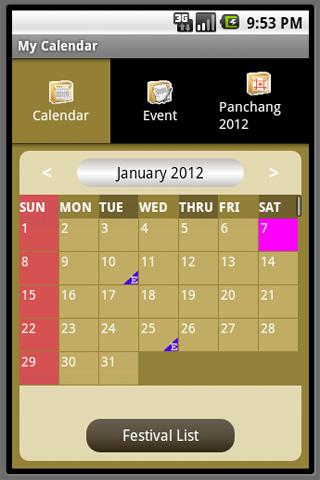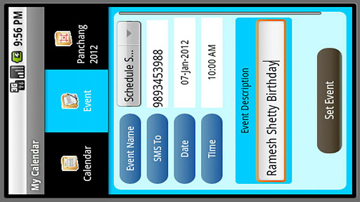 The unique 2012 calendar app with features like Calender, Event Scheduler...more specifically to menion....SMS SCHEDULER...and Panchang 2012. All in one app for your Andriod phone!