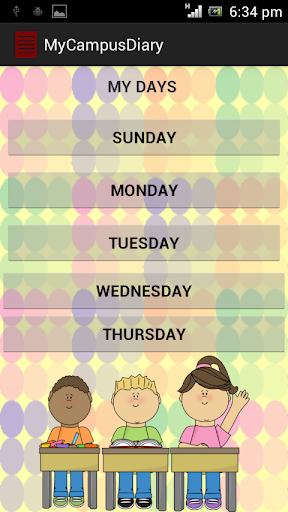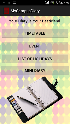My Campus Diary is a planner for students which designed to make your daily routine more easier. My Campus Diary will allowed you to store your class timetable (included time,day and place) and will always give reminder for the upcoming class. So in this case ,students will always be ready and not miss the class.Other than that this application also have provided the features that allows student to write a note in the notepad section. With the user friendly interface student will allowed to save a moment that happen in the whole day life in campus. In this section ,students can use the emoticon and others clip art to make the notepad more interesting to write.In this My Campus Diary application it will have the part to view the list of holidays and student also can use this application to organize the date of important event(example:Birthday date,discussion group)