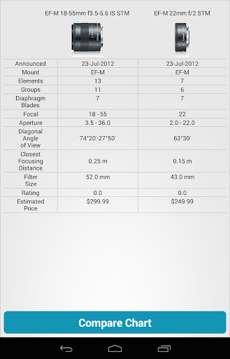 1. View the Canon EF Lens Lineup (include EF, EF-S, EF-M). You can search by name, sort by price, focal, aperture, announced date, rating and filter by Mount.