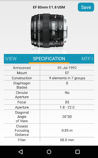 2. View full detail information of a Canon Lens (Overview, Specification, MTF Chart, Sample Images). For Specification, there are: Announced date, Mount, Construction, Diaphragm Blades, Circular Aperture, Focal, Aperture, Angle of View, Closest Focusing Distance, Filter Size, Rating and Estimated Price.