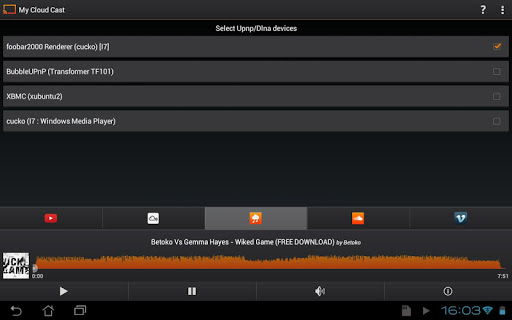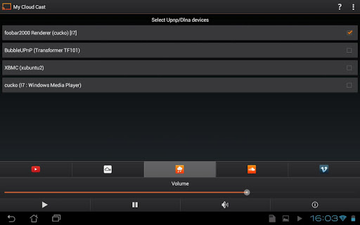 My Cloud Cast lets you stream SoundCloud, MixCloud, YouTube or Vimeo streams to almost any Upnp/Dlna receiver device.