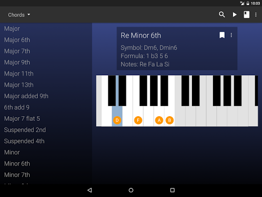 My Piano Assistant is a reference book of chords (with all inversions), scales and intervals. Given the name of an item and a root, the app shows the item formula, symbol (for chords and intervals), the sequence of notes and their positions on the piano keyboard. It also allows to listen to a selected item.