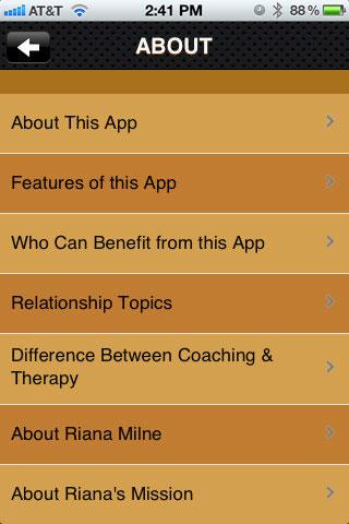 Relationships are the source of most of our happiness or misery. They can be frustrating and challenging. This app provides convenient, safe, and portable relationship information and support from Relationship Coach Riana Milne. It's like having your own relationship coach in your pocket!