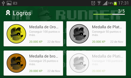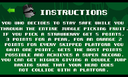 Eres tu quien decide mantenerte a salvo, mientras no te caigas podrás atravesar la selva entera recogiendo frutos. Si recoges una fresa obtendrás 5 puntos, por una pera 3 puntos, por una naranja 2 puntos y por cada plataforma saltada ganarás un punto, obtiene la mayor cantidad de puntos posibles y logra un super récord. Puedes llegar más alto dando un doble salto cuidando que tu cabeza no choque con una plataforma. Atrévete y gana todas las medallas.