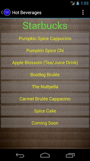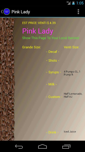 This App makes ordering your favorite Starbucks Drink fast and easy, Just select the beverage that you want, then show the local Barista your phone when the app says to "Show this Page to the Barista". These Drinks were mostly designed by actual Starbucks Employees. NOTE: This is just the lite version, which includes 4 Recipes from each category, except "Other".