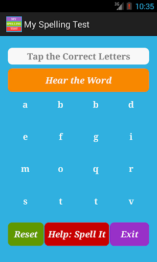 - Spelling Practice - Click "Hear the word" and tap the correct letters for spelling. Each letter you type the text color changes to either "Green" (shows you that you are in the right track) or "Red" and Vibrate to warn you. Once you find the correct spelling it will move to the next word. There is a Help button that can Spell the word to give you further assistance.
