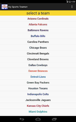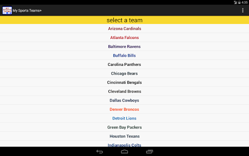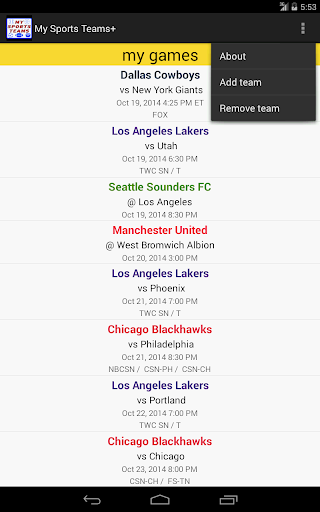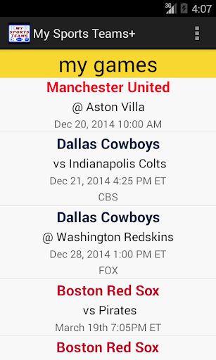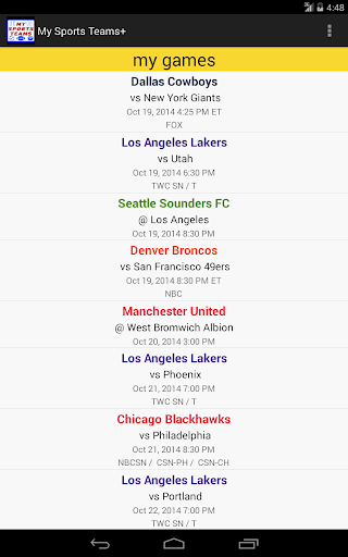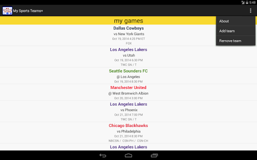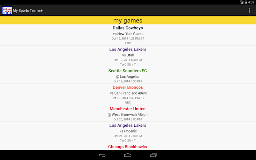 Upcoming game schedules for all your favorite pro sports teams in one place. The app currently supports football, baseball, hockey, basketball and soccer from the following leagues: