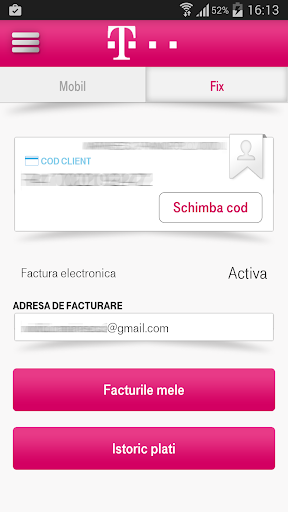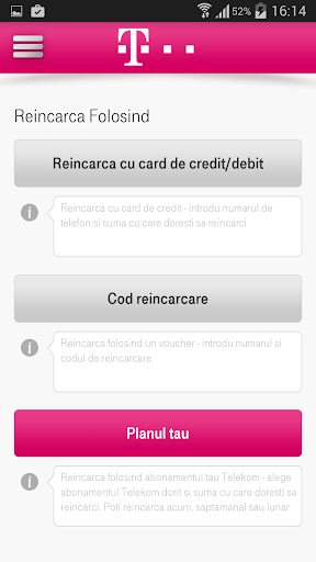 Cu noua aplicatie mobila de MyAccount Telekom poti accesa informatii despre facturi cu posiblitatea achitarii acestora, abonamentele curente, infoCost, reincarcare electronica prin plata cu cardul sau voucher precum si folosirea abonamentului propriu, locatii ale magazinelor Telekom si partenere precum si notificari cu privire la emiterea unei noi facturi, aflare cod PUK sau restrictionare numar de telefon in caz de pierdere sau furt, oferte si promotii speciale.
