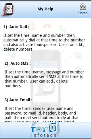 • This application provides the user the facility of automatic conduction of all tasks of the phone like dialing, messaging, E mailing, etc.