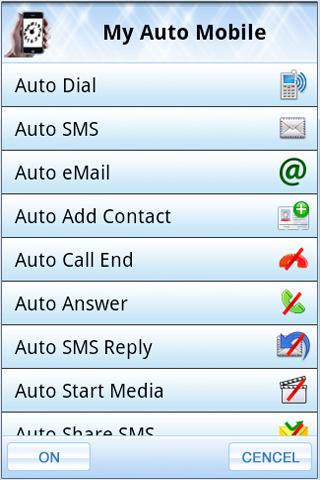 • My Auto Mobile has the feature of automatic call answer, automatic loudspeaker activation, automatic call termination, automatic SMS reply, automatic SMS share.