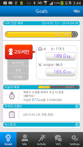 - Goals : 건강목표를 설정하여 운동 기록을 관리 할 수 있으며 미션을 확인하여 운동량 체크할 수 있다.