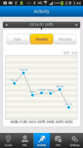- Activity : 활동량을 일, 주, 월 단위 그래프로 확인 할 수 있다.