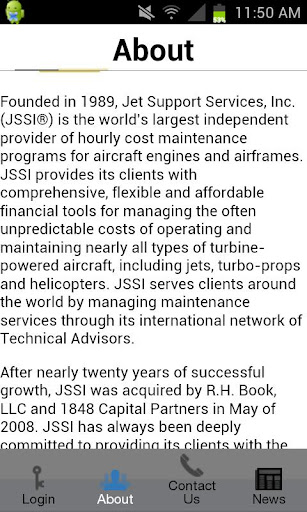 The MyJSSI Mobile App is an App for existing Jet Support Services, Inc customers to submit their flight hours, manage their contracts and contact information and make their payments.