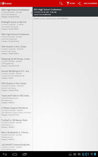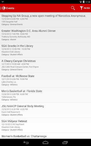 • Events - View upcoming events, filter by category, add to device personal calendar.