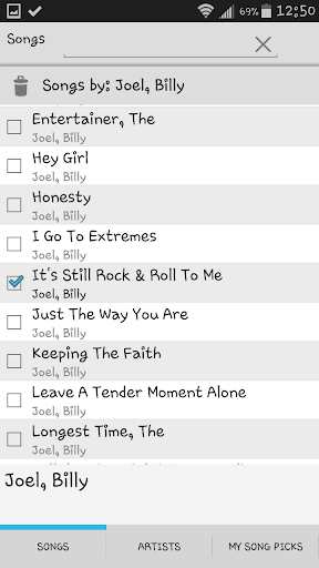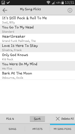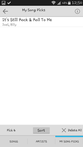 4) Tap My Song Picks to see the songs you have picked. To remove a song from the Picks List, swipe right and tap Delete. Delete all the songs by tapping Delete All. Sort the list by song title by tapping Sort.