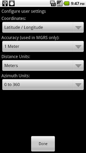 MyMGRS is a GPS utility to get your location in MGRS (Military grid reference system), UTM (Universal Transverse Mercator) and latitude/longitude. It allows you to touch the screen and get that location and the range/azimuth to that point from your current location.