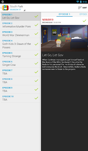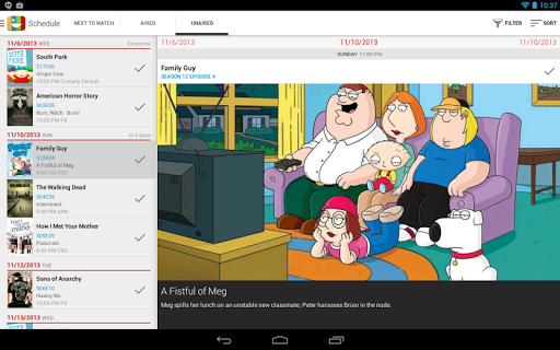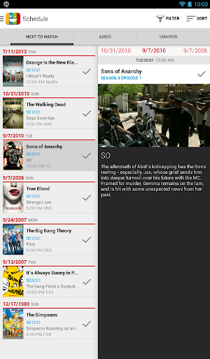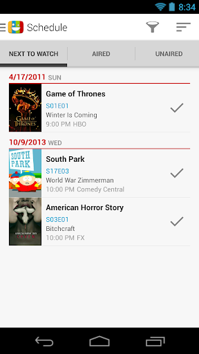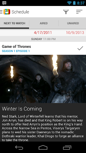 - Follow your schedule in three different episode lists: next to watch, aired and unaired.