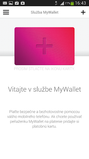 Aplikácia MyWallet Mobilná peňaženka je určená pre zákazníkov spoločnosti Slovak Telekom, ktorí využívajú paušálne služby Telekomu a disponujú NFC SIM kartou v kompatibilnom mobilnom telefóne. MyWallet okamžite zmení váš smartfón na digitálnu peňaženku. Ide o inteligentný spôsob ako platiť v súčasnosti - jednoducho, rýchlo a pohodlne použitím vášho smartfónu. Na ceste do práce viac nemusíte hľadať drobné na zaplatenie kávy, proste zaplatíte bezkontaktne použitím mobilného telefónu.