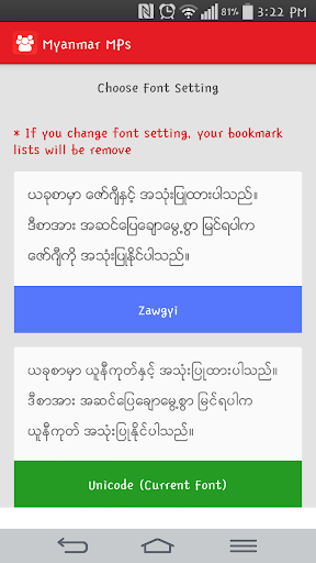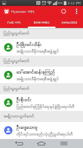 Myanmar MPs is the product of Open Myanmar Initiative and developed by Myanmar Links. You can find your Member of Parliament easily. You can contact your MPs via MyanmarMPs by email, SMS, Facebook and Youtube.