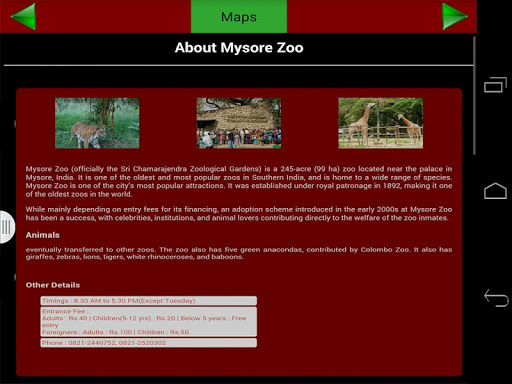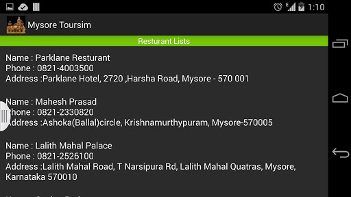 The Mysore Tourism App (Beta Version) gives the information about Mysore, a city located in Karnataka, India.Mysore is very well known for YOGA. The app provides the information about the places in and around Mysore. The app also provides information about the Restaurants, Accommodation, Yoga centers in Mysore. The app is also integrated with Google Maps. In one word, this app serves as a pocket travel guide for the people who visit Mysore
