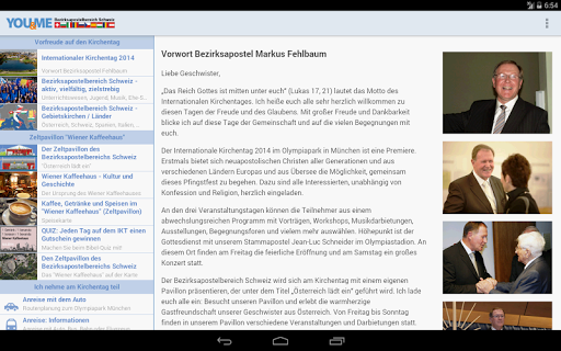- Ein Quiz, in dem an jedem der drei Tage ein Gutschein für ein kostenloses Essen und Getränk im „Wiener Kaffeehaus“ (dem Pavillon des Bezirksapostelbereichs Schweiz auf dem Kirchentag) gewonnen werden kann