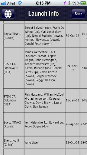 - A database of launch and mission information for every manned space mission including the United States, Russia, and China.