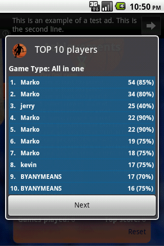 A Quiz Game for one or two players, with questions about NBA basketball. Every round has 20 question with different time limit. It has three difficulty levels. You can choose game type for different with different questions. There are questions about NBA history (winners and losers, finals), teams (scores, players,...) and players (teams, legends, nickmames,MVPs,...) and allstars