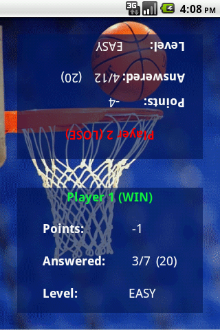 Two players can play agains each other on one device. First player that answers question scores (minus points for incorrects answers).