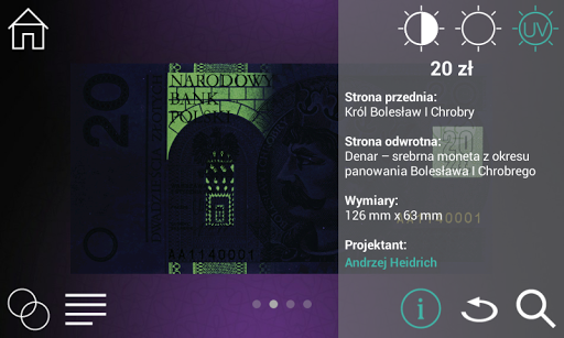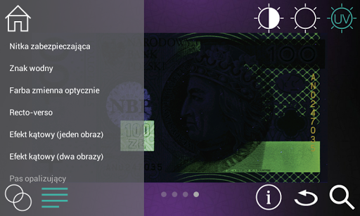 -zobacz, jak wygląda banknot oglądany pod światło, a jak w promieniach UV,