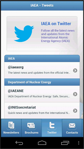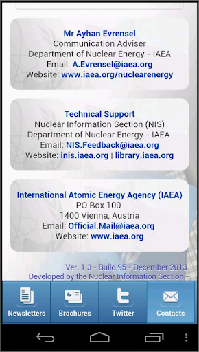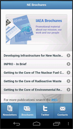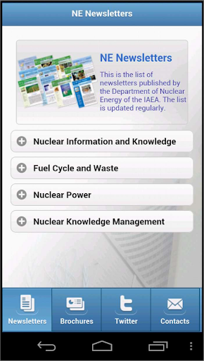 NE News for Android is a free app developed by the Nuclear Information Section (NIS) for Android devices. NE News works as a single point of access to regularly updated electronic publications and social media channels of the IAEA Department of Nuclear Energy.