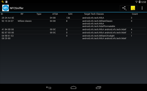 This app allows you to explore the contents of the RFID/NFC enabled smart card transponders. This is very useful for anyone programming NFC applications, or for anyone who wants to see what transponders they are carrying around in their purse or wallet.