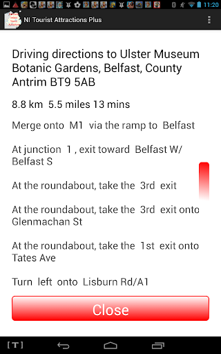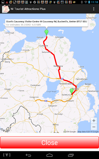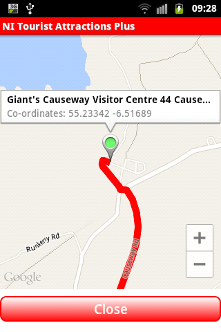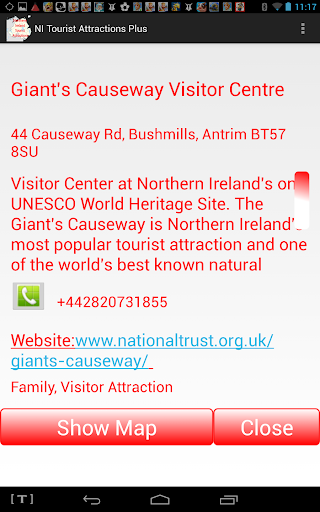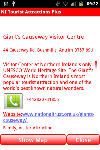 Northern Ireland Tourist Attractions displays a list of over 50 of the most popular tourist attractions in Northern Ireland and will display information about the selected attraction. The app also displays a map showing the route from the current location to the selected attraction and enables users to easily contact the attraction.