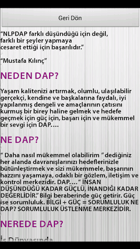 Yaşam kalitenizi artırmak, olumlu, ulaşılabilir gerçekçi, kendine ve başkalarına faydalı, iyi yapılanmış dengeli ve amaçlarının çatısını kurmuş bir birey haline gelmek ve hedefe geçmek için güç için, başarı için ve mükemmel bir sevgi için DAP….