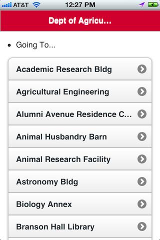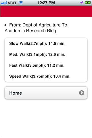 Your position is shown on the map along with all of the campus buildings. Tapping on a building will bring up a list of other buildings to choose from indicating your destination. It will display four walking speeds and the time (in minutes) it will take to walk to the chosen building from the selected list.