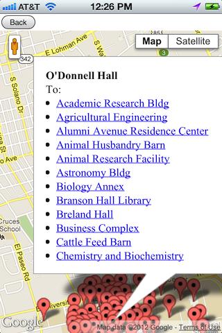 This app is specifically designed to show New Mexico State University students about how long it will take to walk from one campus building to another based on walking speed (2.7, 3.1, 3.5, or 3.75 mph). Most colleges allow only 10 minutes between courses and sometimes it takes longer than that to get to the next class.