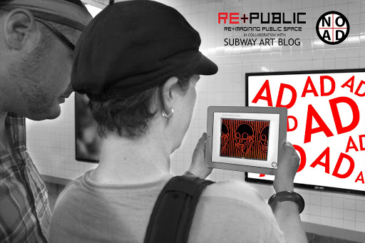 NO AD, created by Re+Public (PublicAdCampaign + The Heavy Projects) in collaboration with The SubwayArtBlog, aims to remedy this imbalance by using the preexisting advertising infrastructure as a new digital exhibition space. Users are encouraged to download the free iOS or Android app to their smart devices. Once the app is running, simply pointing your device at any of the 100 most widely circulating subway platform advertisements will cause the device to overlay curated digital art content, creating an augmented experience that blocks unwanted advertising. (See below for the specific subway platform advertising format NO AD works on)