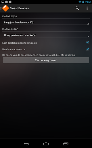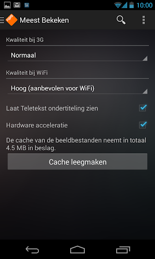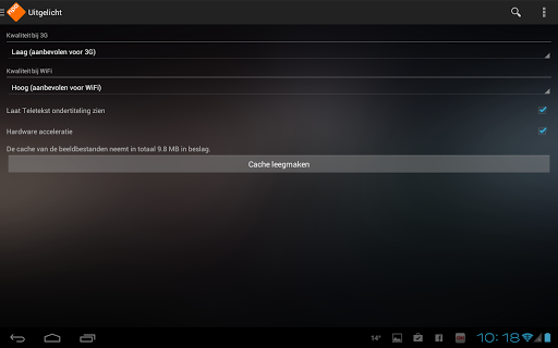 • Om de uitzendingen onderweg of op locatie te bekijken heb je een stabiele 3G- of WiFi-verbinding nodig. In de applicatie kun je zelf de videokwaliteit instellen op laag, normaal en hoog. Let op: Als je een hogere kwaliteit kiest voor 3G kost dit meer dataverkeer. Het bekijken van video kan dan hoge kosten met zich meebrengen. Hou er rekening mee dat de kwaliteit van je 3G-signaal sterk kan veranderen wanneer je snel beweegt, zoals in een rijdende trein.