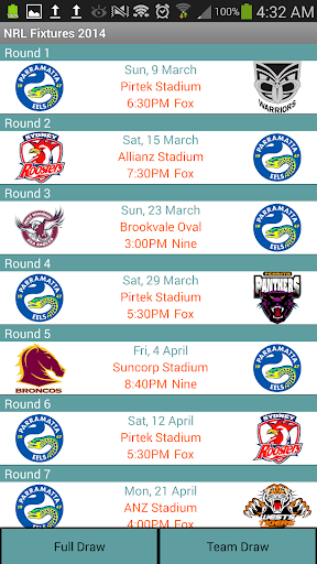 Match times for the National Rugby League competition for 2014. Includes the full draw or filter by your favourite team. Match times are displayed in the devices local timezone. Quickly access the fixtures without internet access.