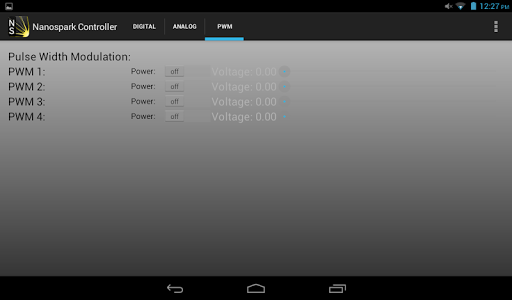 The Nanospark Controller provides full control for the IOIO-OTG board. It allows the users to manipulate various analog and digital inputs and outputs. As well as allows for pulse-width modulation control.