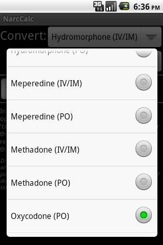 Quickly and easily convert between various narcotics and opiods. Select from a drop-down menu of many commonly used opiods, with the option of selecting PO or IV/IM. Calculates the equivalent dose based on user-inputted dose.