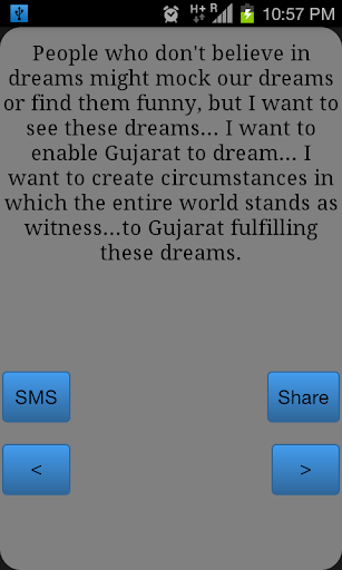 When Narendra Modi speaks, people listen. The chief minister of Gujarat seems to know his audience well. They cheer him on and jeer at his opponents; they applaud every two minutes. But sometimes, what he says catches people’s attention. Yes, this application shows you many apt quotes quoted by Mr. Narendra Modi.