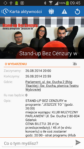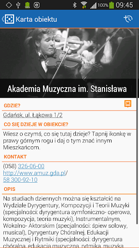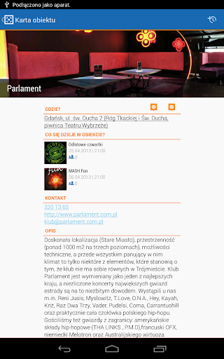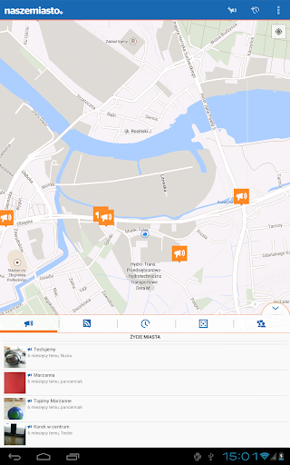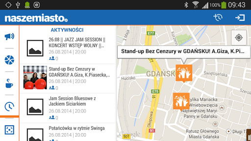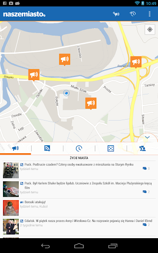 Aplikacja prezentuje wszystkie dane na listach oraz towarzyszącej im mapie, tak, byś zawsze mógł łatwiej zorientować się w okolicy. Pierwsza zakładka z danymi to „Wydarzenia”, gdzie zobaczysz bieżące treści dotyczące Twojego miasta, zredagowane dla Ciebie przez naszą pracowitą redakcję. Obejrzysz powiązane z nimi zdjęcia, będziesz mógł też przesłać swoje oraz wyrazić zdanie o poruszanym temacie i poznać opinie innych.