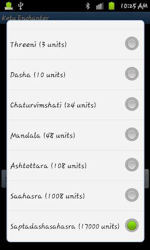 The repetition is traditionally done in a set of 'number presets' (usually 17000 times for South Node God) that is usually thought to invoke the right amount of energy sustainable by the human mind. The application comes with these preset numbers that can be selected depending on how much time you have to spend during each session. Once you choose a preset number, you can either repeat the mantra that many times, or for those many minutes. Hitting the back button exits the application, but remembers how many times you have repeated the mantra. Each time you start the application you can choose to either resume your last session or start a new counting session altogether. You may reset the counter to zero via the menu option too.