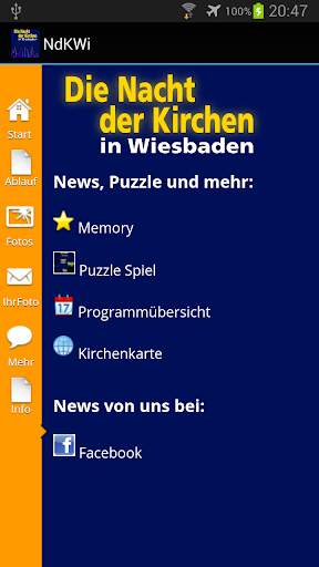 - "Ihr Foto"-Button zum Aufnehmen und Absenden Ihres Fotos von der Nacht der Kirchen direkt an das Team der Nacht der Kirchen. Wenn Sie möchten, veröffentlichen wir das von Ihnen durch die App eingesandte Foto auf der Facebook-Seite der Nacht der Kirchen. Bitte schreiben Sie uns Ihre Zustimmung dazu ausdrücklich in die Nachricht zum Foto.