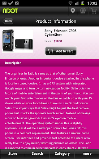 NDOT Mobile commerce is an entirely new concept brought in for the mobile users. N.Mobile commerce allows the users to browse their mobile phones and order their needed products. They have options to pay using the PayPal, Credit card, Cash-on-delivery, or Pay-in-shop. The shops can be located geographically.