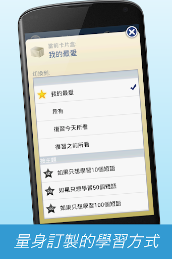 任何Nemo卡片都可以加入“收藏”列表中,用戶可以制作自己的卡片集,主攻學習這些短語。打開復習模式,回顧之前練習的卡片,幫助鞏固記憶。
