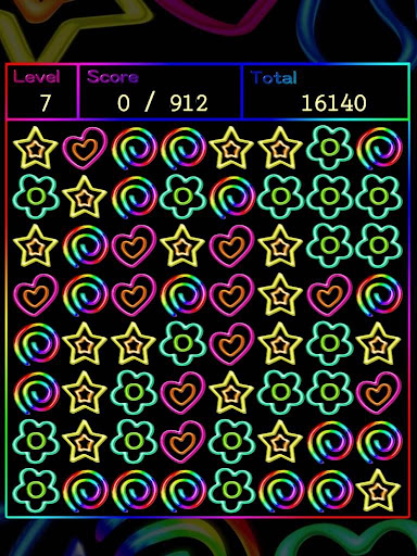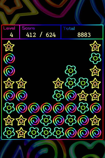 NeonSpark is played on a rectangular field, typically initially filled with some kinds of blocks placed at random. By selecting a group of adjoining blocks of the same color, a player may remove them from the screen. Blocks that are no longer supported will fall down, and a column without any blocks will be trimmed away by other columns always sliding to left side. The goal of the game is to remove as many blocks from the playing field as possible.