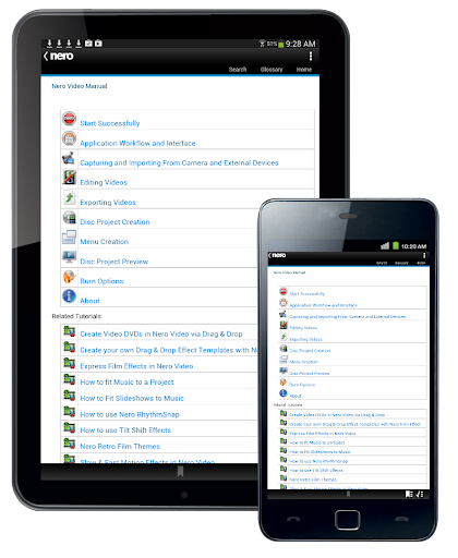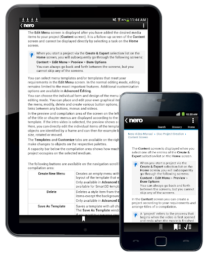 Android® 平板電腦或智慧型手機上的 Nero Video Manual App 可以用於包括 Nero Video 在內的各種 Nero 電腦產品,例如 Nero 2015 Platinum、Nero 2015 Classic 以及 Nero Video 2015。