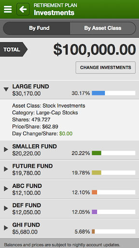 • Retirement Accounts — Keep your financial goals on track by monitoring your plan balances (including pension, if available) and investments, your plan’s account performance, and more.